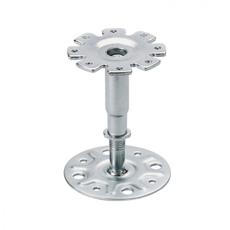 Enviroflor - 115/200mm - BSEN Light Duty Pedestal. . Fully compliant and tested with the Enviroflor DB Green panel to BSEN12825:2001. Mild Steel Disc 90mm in diameter by 2mm thick welded onto a 22mm outside diameter mild steel tube reduced at one end to take the mating thread of the base. The locking nut allows fine adjustment of the head to the correct finished floor height and can then be fixed with adhesive. A variety of different pedestal caps are available to suit field, stringers etc. 16mm threaded mild steel tube is galvanised and cut to a suitable length. The base is mild steel 80mm x 80mm square, with the central boss housing the steel tube.